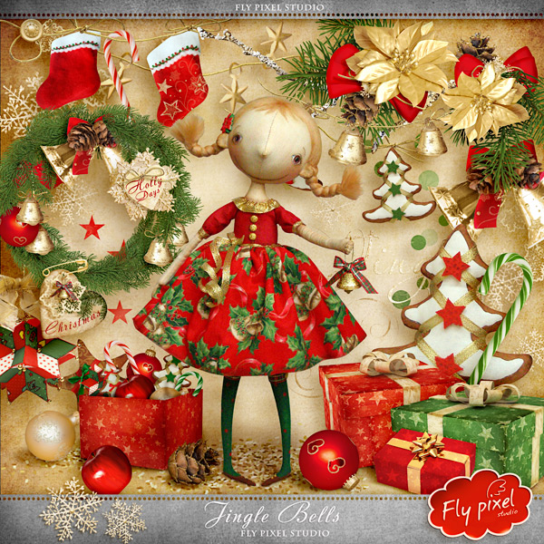 Tipikus ünnepi készlet: díszek, fenyőág, csengők, ajándékok, piros, arany, zöld, krém. Ez mind jellemző erre a 12 papírból, 65 elemből és 3 WA-ból álló készlet.